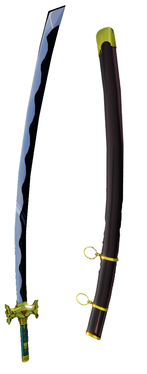It appears as a simple and curved sword with a golden crossguard. The crossguard has a red gem in the middle. The sheath appears to be a very simplistic sheath made from some sort of fabric or wood, along with gold parts on it.