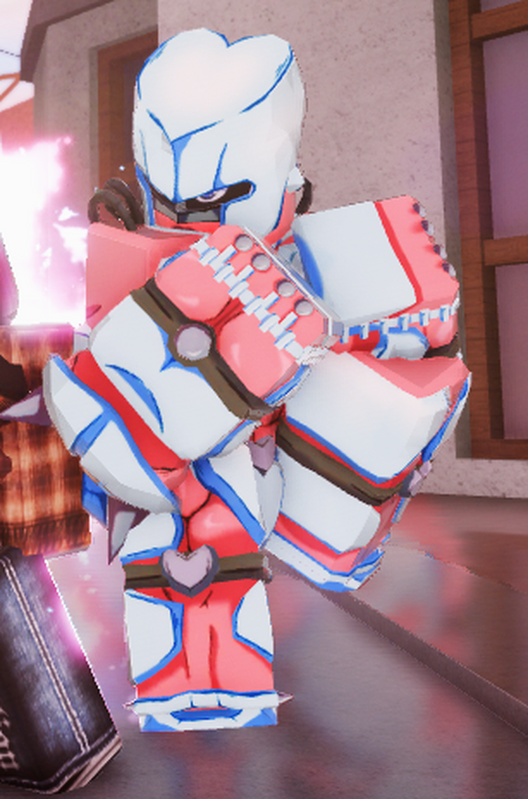 Crazy Diamond is a humanoid Stand with what looks like pink skin. It wears diamond colored armor and highlights all over his body with a sort of heart motif. His head seems to be inspired by that of ancient Greek armor.