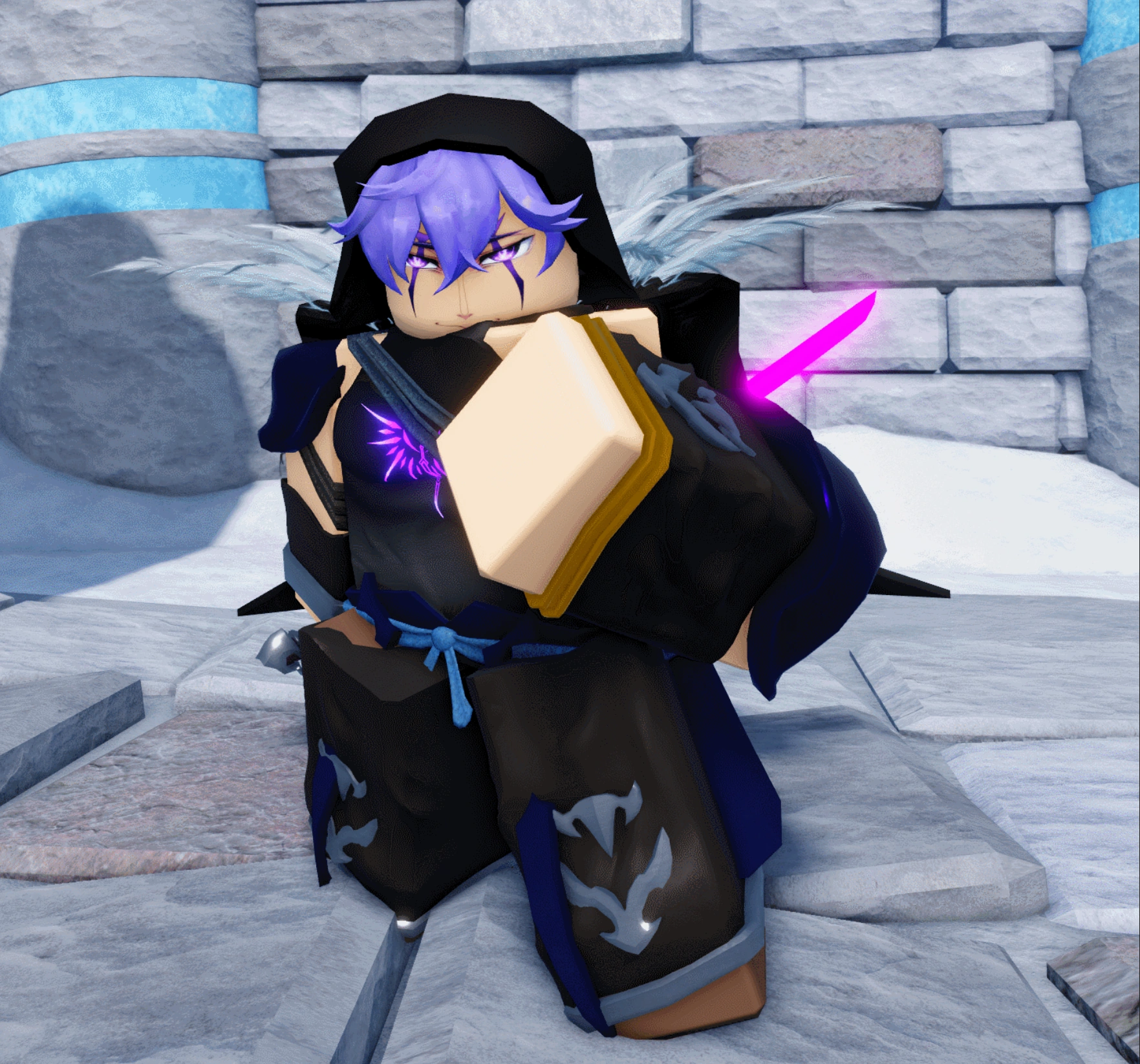 Umbra went through a redesign since his release, originally looking like EpicFlow203/Umbra (NPC) to now looking like Vholran Igniseri, the final boss of Tales of Arise. He bears the mark of the Sovereign, with a black pant and sleeveless shirt, covered in steel armour and gilded gold. He also wears a cape lined with feathers and a hood, with a fringe of purple hair hanging over his face, smirking as he knows that the last thing you will see is his blade against your throat.