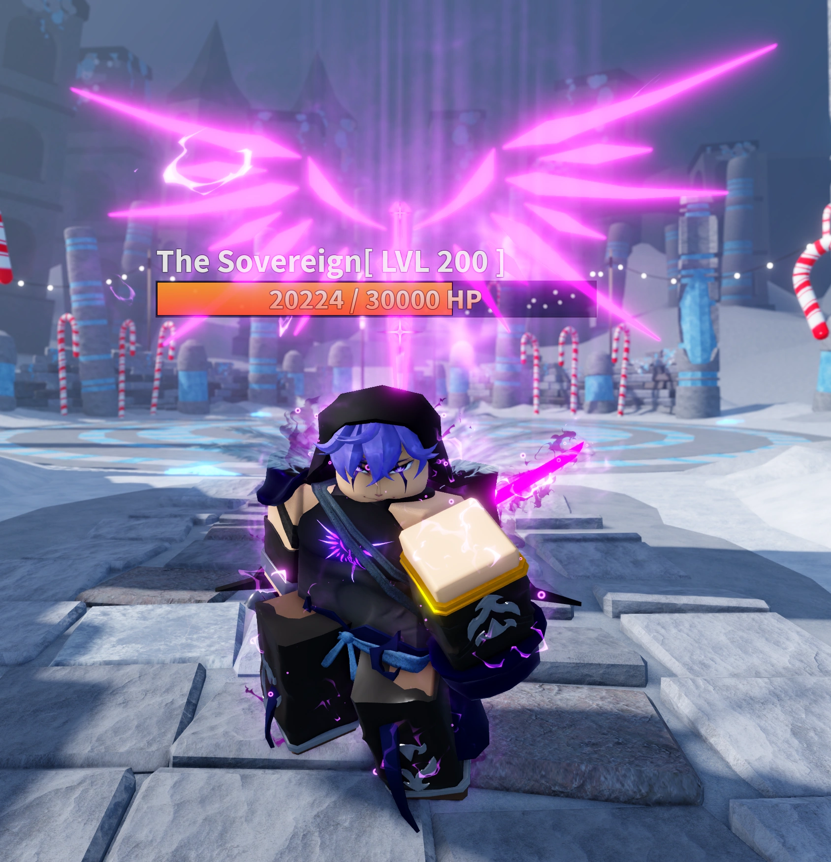 The Sovereign is a boss that wields the Mythical ability Umbra, and is able to decimate his opponents by his sheer power and speed. Located within a forgotten land, he rests and waits for his opponents to claim the cold throne for themselves, knowing that they stand no chance.